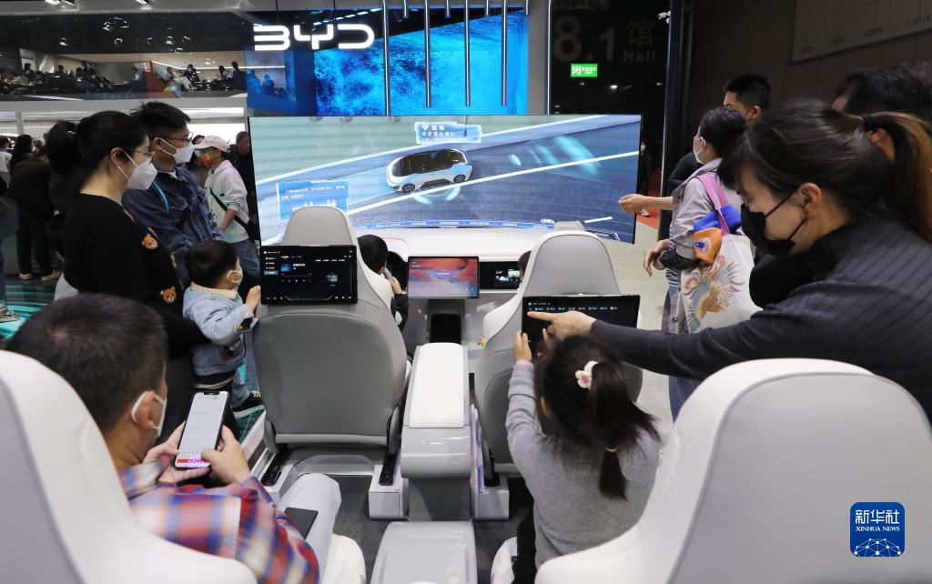 4月24日,參觀者在比亞迪汽車藍寶堅尼零件展臺親身汽車零件經歷車輛智能感知系統模擬器德系車零件